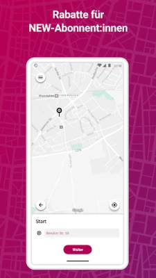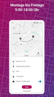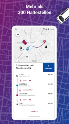 In der App zeigen wir den Weg zum Abholort, dort wartet für dich das Shuttle. Du kannst live mitverfolgen in der App, wo genau sich dein Fahrzeug auf dem Weg zu dir befindet. Wir fahren Dich dann zu einer sogenannten virtuellen Haltestelle, die meist nur wenige Meter von deinem Zielort entfernt ist.